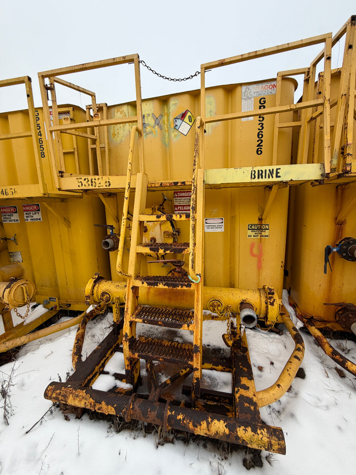 Please note that you as Purchaser are responsible for providing equipment, at delivery, to lift the frac tank(s) off the transport semi-tractor, the tongue weight is approximately 8,000 pounds.  As an alternative, you can use wooden blocks to temporarily block up the tank so that the tractor can disengage from the frac tank and drive away; if so, place the blocks under the rails about 15 feet back from the front of the tank where the blocks should be about 30 inches from the rail to the ground.